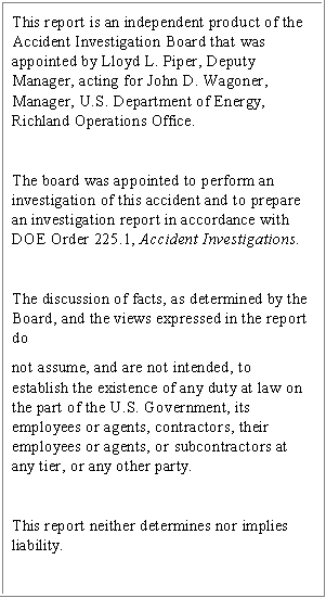 On May 16, 1997, Lloyd L. Piper, Deputy Manager, acting for John D. Wagoner, Manager, RL, formally established an Accident Investigation Board (hereafter referred to as the Board) to investigate the explosion in accordance with DOE Order 225.1, Accident Investigations. However, the Board began its investigation on May 15, 1997, completed the investigation on July 2, 1997, and submitted its findings to the Manager, RL, on July 24, 1997.